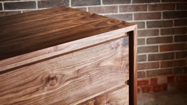 With this piece as well as the material choice and line detailing, the grain direction and flow running around the outside of the piece and through the solid Walnut drawer fronts complete the design.
