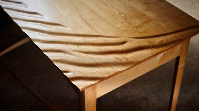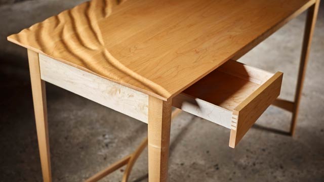 The discreet drawer is constructed in solid Maple with dovetail joints, with a Birds eye Maple base, while the chair seat is finished with a clean light cream leather for an elegant finish.