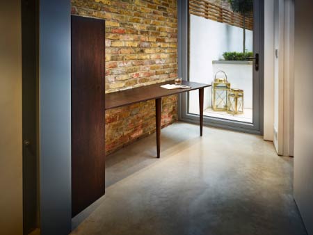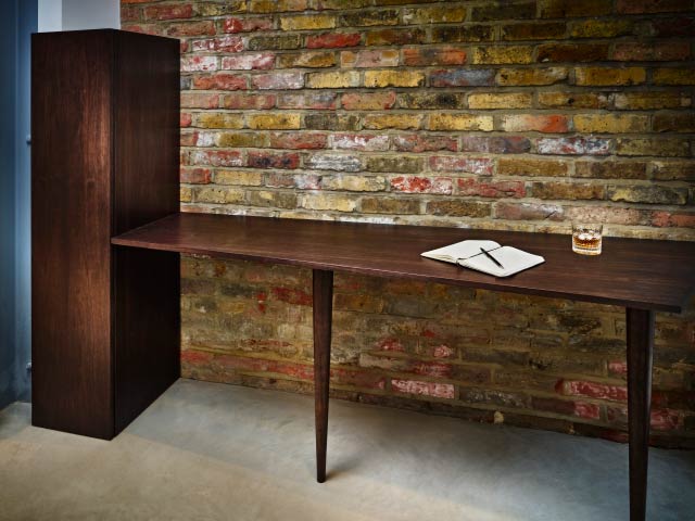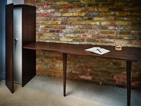 Concealment and function are combined within the same piece to create a fitted desk with a concealed gun cabinet at one end. The cabinet door is fitted with a discreet push latch mechanism and polished brass butt hinges. Two solid Walnut turned legs support the front of the desk while discreet fixings support the back.