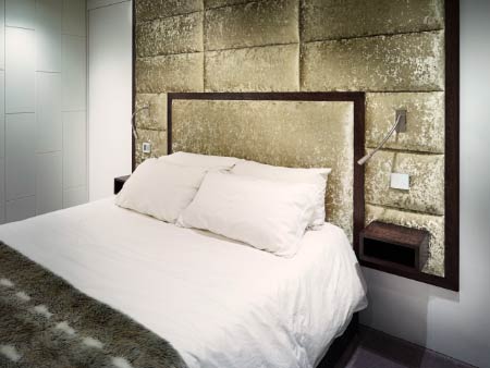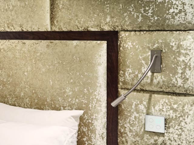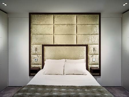 Reading lights and touch-sensitive switches were installed within the upholstered panels, along with Walnut bedside alcove shelves.